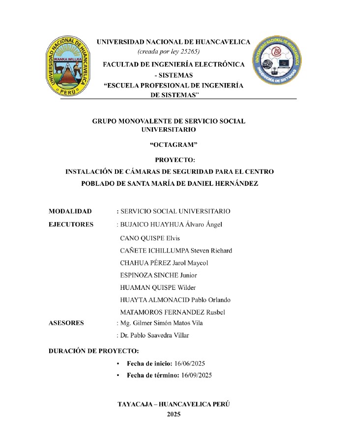 La Universidad Nacional de Huancavelica, a través de sus estudiantes de la Escuela Profesional de Ingeniería de Sistemas, viene desarrollando el proyecto de servicio social titulado “Instalación de cámaras de seguridad para el Centro Poblado de Santa María de Daniel Hernández”, con el objetivo de contribuir al fortalecimiento de la seguridad institucional y ciudadana..